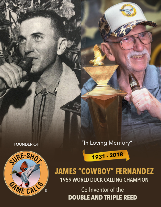 Groves, TX – (August 17) – Sure-Shot Game Calls is sad to share the news that co-founder, inventor and world champion caller James “Cowboy” Fernandez passed away yesterday in Beaumont, Texas at age 86. The entire Sure-Shot Game Calls family, friends and fans mourn his loss and extend our sympathies to his family. Cowboy worked with George Yentzen to design and patent the first double reed duck call in 1950 and the triple reed in 1968. Cowboy was the first Texan and first double reed contestant to win the Worlds Duck Calling Championship in Stuttgart, Arkansas in 1959 using the double reed Yentzen Caller. And others followed, winning World Championships with this Yentzen Caller as well. He was well known for his calling prowess and won numerous regional and international competitions. Fernandez was inducted into the Legends of the Outdoors Hall of Fame in 2014. “There was only room in this world for one Cowboy Fernandez,” explained Charlie Holder, current owner of Sure-Shot Game Calls. “He will be sorely missed. We greatly appreciate all of the support, messages, and well wishes from the friends and fans of Sure-Shot.” For more information about Sure-Shot’s complete line of game calls, visit www.sureshotgamecalls.com. About Sure-Shot Game Calls: The 60+year old company was founded by James “Cowboy” Fernandez and George Yentzen in Nederland, Texas in the early 1940s. After many prototypes, their first product, the 1950 Yentzen Caller, became the very first patented double-reed duck call introduced to the marketplace. In 1959, Cowboy Fernandez entered several duck calling competitions and both he and the Yentzen Caller became world class champions. Charlie Holder purchased the company in 2011. Today, Sure-Shot offers over two dozen game calls for waterfowl, predator, deer and turkey. ### |